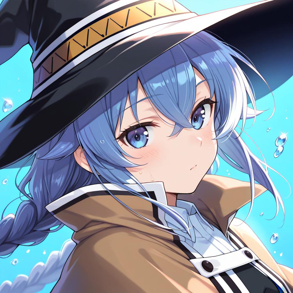 Roxy migurdia, 1girl, bangs, black headwear, blue background, blue eyes, blue hair, braid, brown cape, cape, close-up, floating hair, hair between eyes, hat, long hair, looking at viewer, portrait, solo, water drop, witch hat, ((masterpiece)), blue light