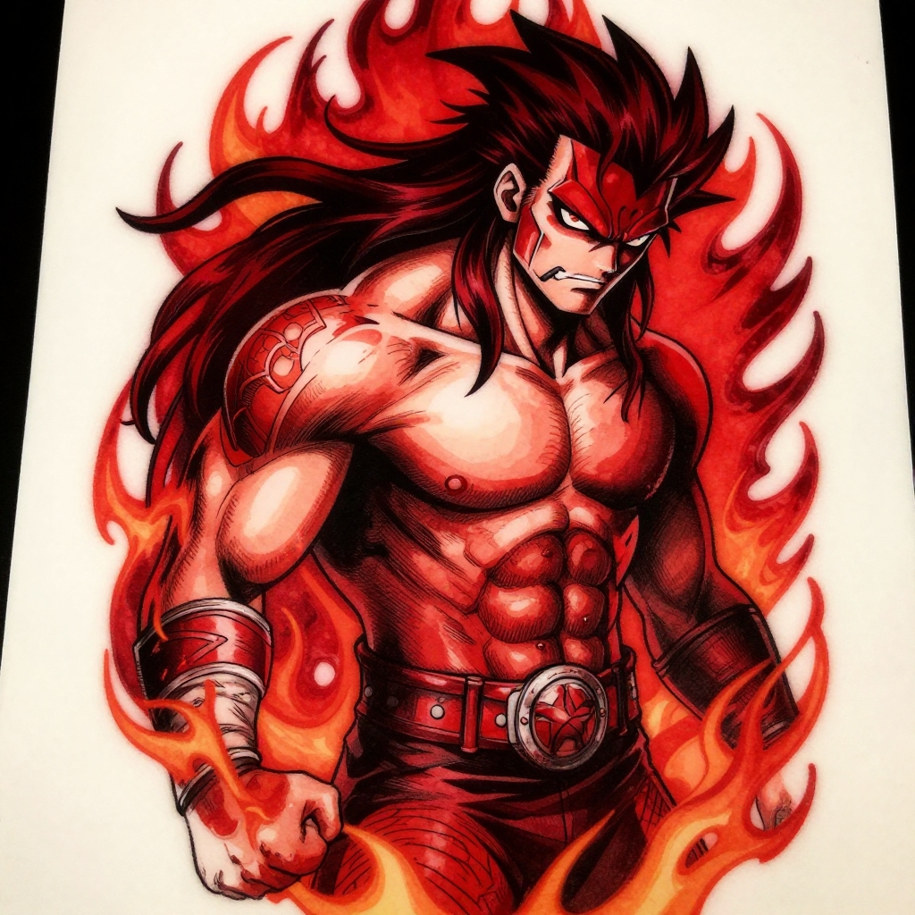 Intricate anime-style tattoo design featuring a muscular male character with long flowing hair, red and black ink tones, intense expression, and fiery chaotic background. The character displays bold, sharp lines and detailed shading with a dynamic pose, wearing a belt and arm guards.