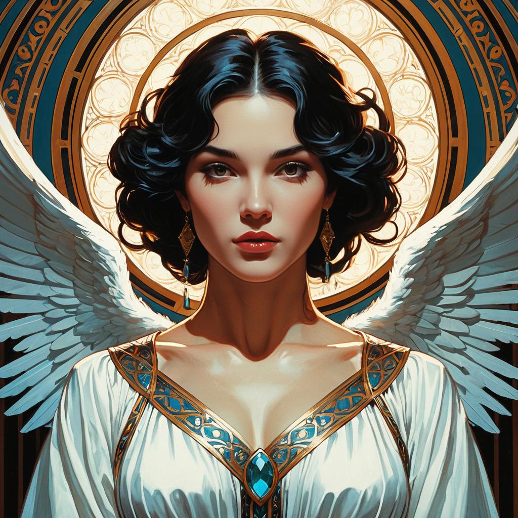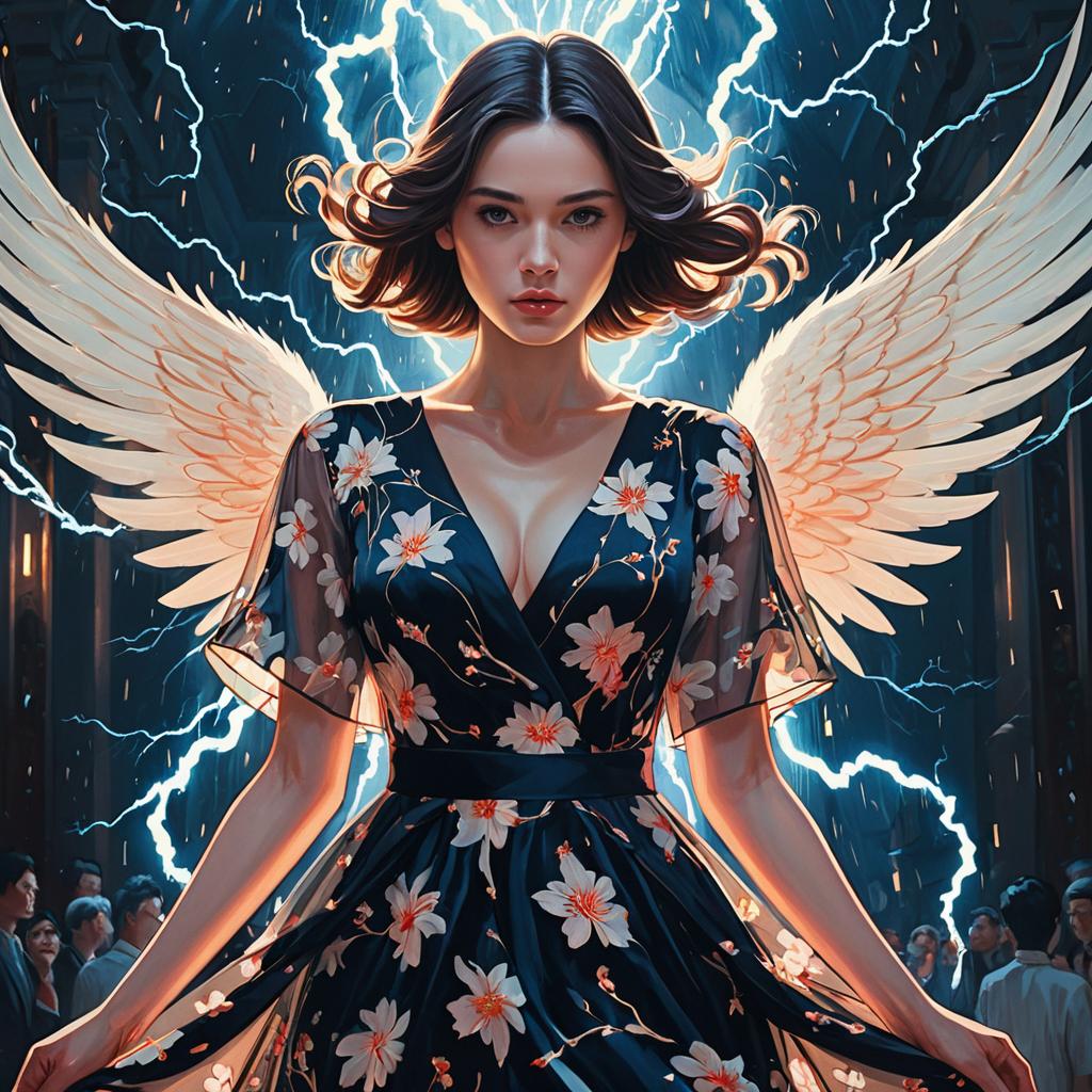 Character design by james jean, ruan jia, ilya kuvshinov, martine johanna, jakub rebelka portrait of sexy angel in seductive luxurious flowy flowery dress emerging from lighting and powerful thunder, sharp edges. ultra detailed, majestic, intricate,