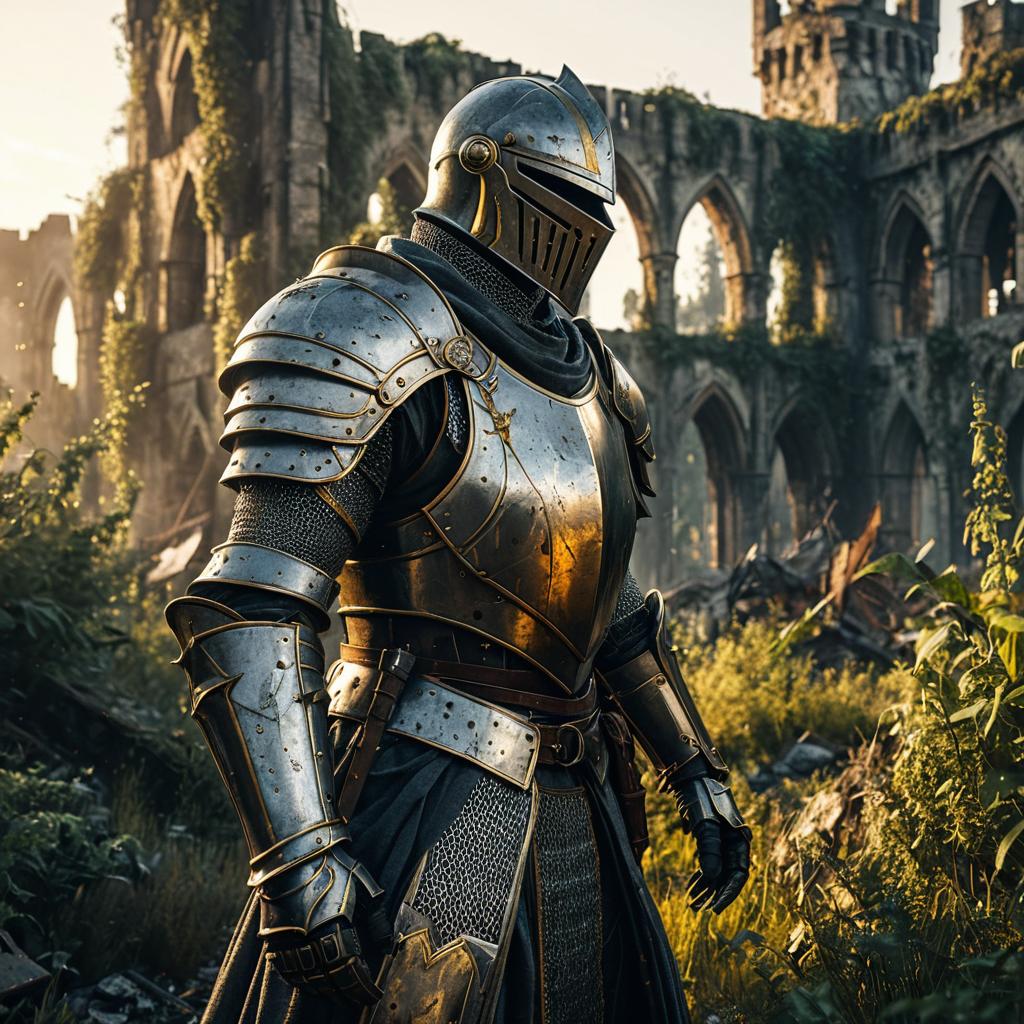 Medieval knight in futuristic armor roaming ruined city with overgrown vegetation, cinematic close-up with golden hour lighting and drifting mist, octane render, ultra-realistic photorealistic 8K hyper-detailed textures, award-winning ArtStation quality.
