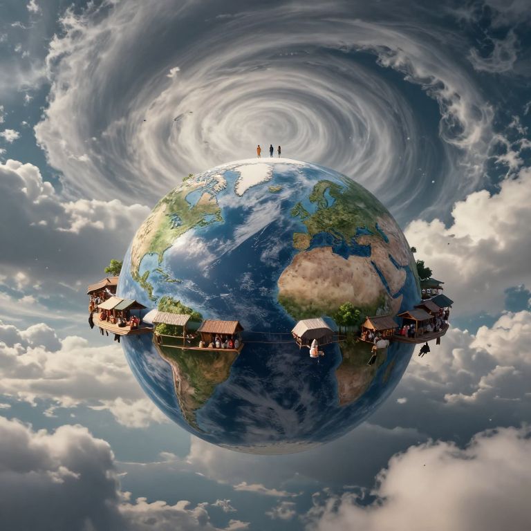 Digital artwork of a surreal, floating Earth with small wooden houses and three tiny figures standing on top, surrounded by swirling clouds.
