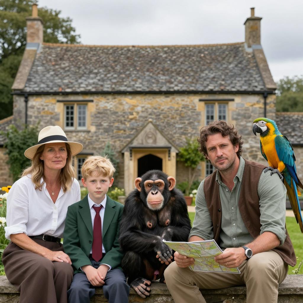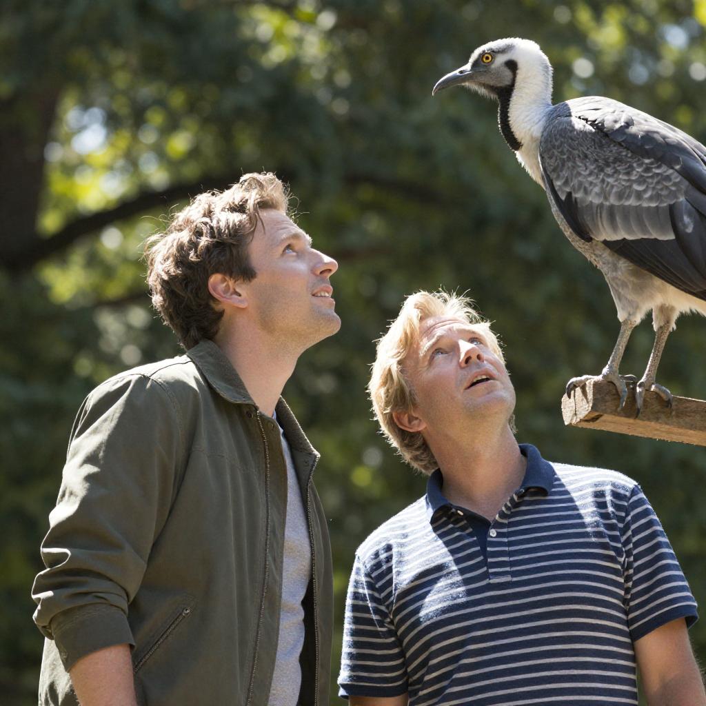 Photograph of two men standing outdoors, looking up at a large bird with a gray and white plumage. The man on the left has brown hair, wears a green jacket, and leans slightly forward. The man on the right has blond hair, wears a striped polo shirt, and looks upward with his mouth slightly open. Sunlight filters through the trees in the background.