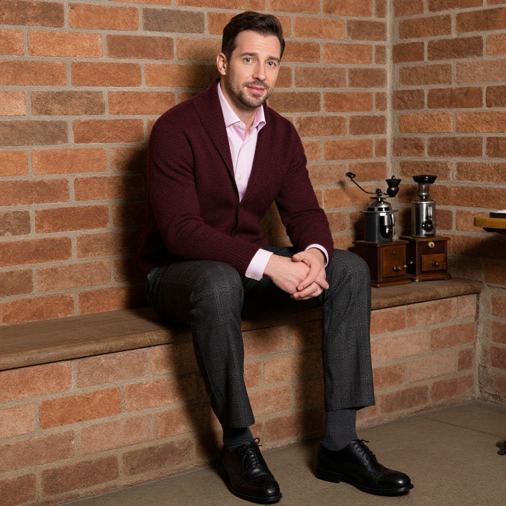 A man, burgundy merino wool cardigan, light pink dress shirt, charcoal plaid dress pants, black leather brogues, modern preppy vibe, cozy nook, exposed brick walls, vintage coffee grinders, cameraphone style, relaxed smile, warm ambiance. Man has masculine face and piercing eyes