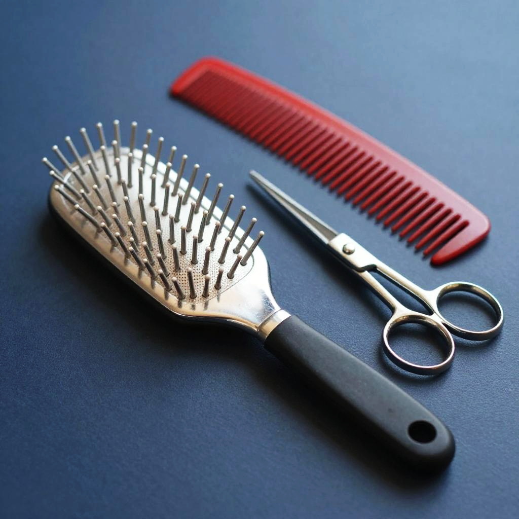 Close-up photo of a silver hairbrush with a black handle, a red comb, and a pair of small silver hairdressing scissors with round handles. The tools are arranged on a dark blue surface, showcasing typical hair grooming essentials.