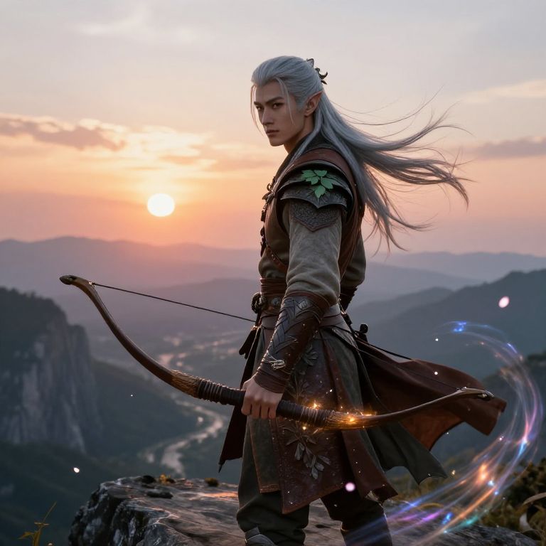 Fantasy male elf warrior poised on a cliff overlooking a mystical valley at sunset, long flowing silver hair and sharp features, leather armor with leaf motifs, holding a glowing bow, surrounded by swirling magical winds and floating petals.