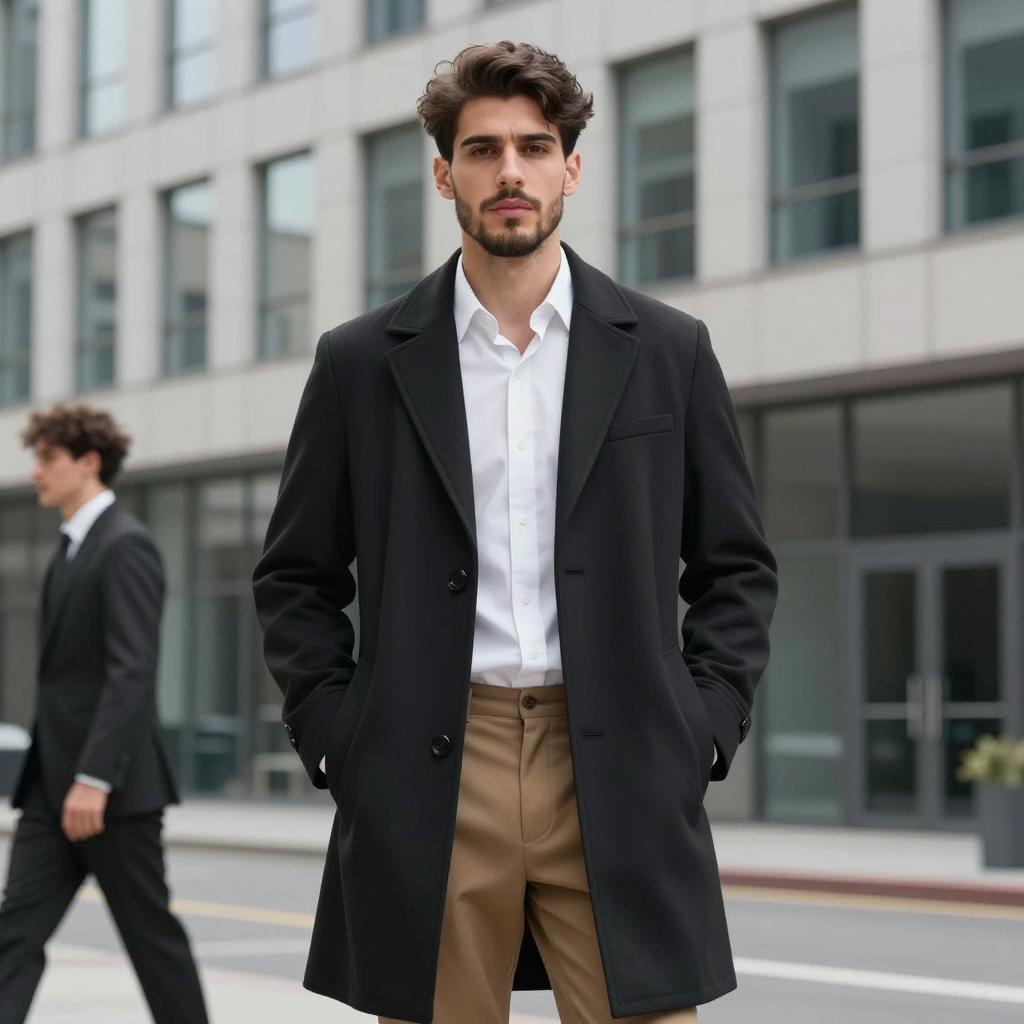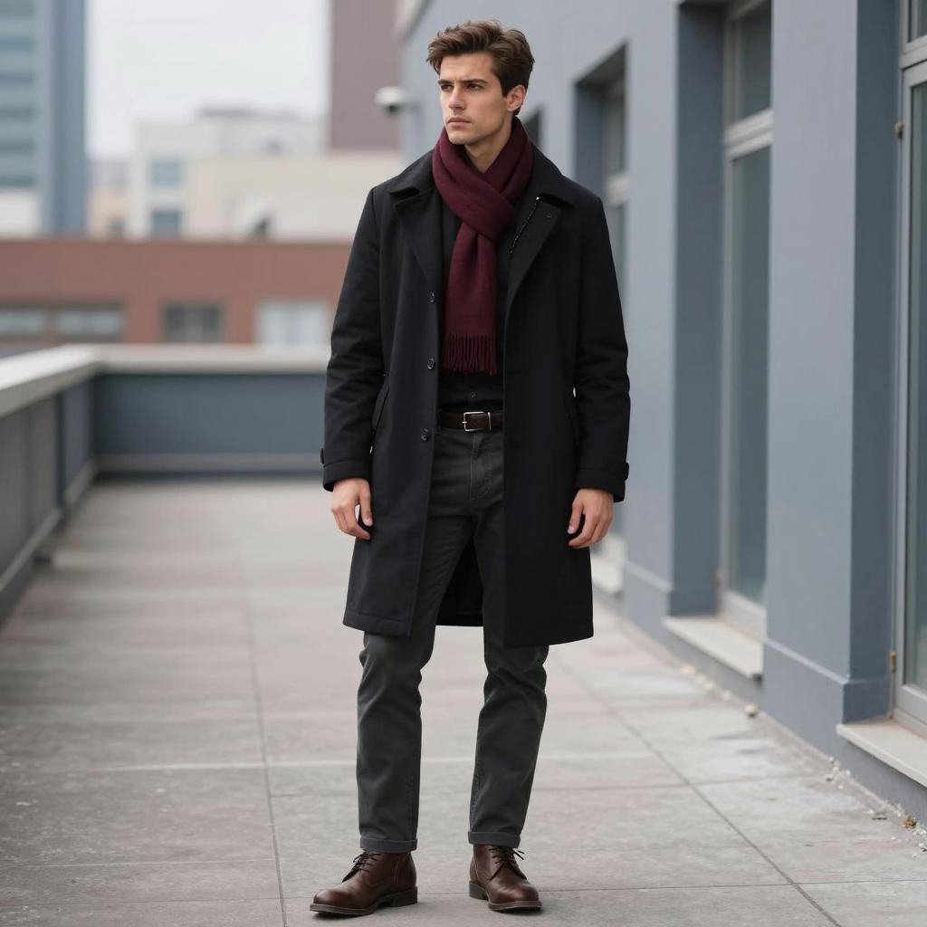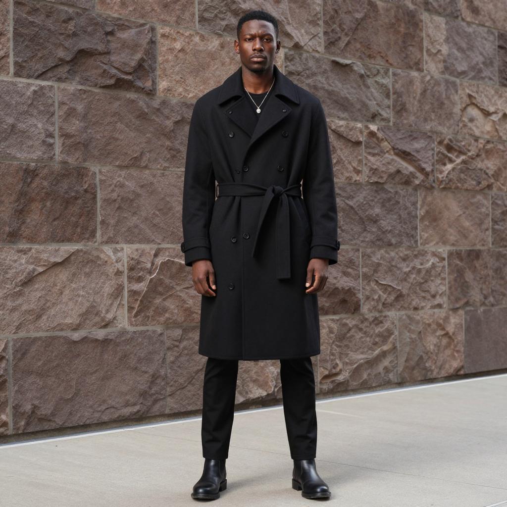Black man fashion costume, photograph of a tall, black male, standing in front of a rough, brown stone wall, wearing a long black coat with a tied belt, black pants, and black boots, short black hair, serious expression, daytime, neutral background, full body shot, casual streetwear style, medium lighting, no accessories except a silver necklace with a pendant, standing on concrete floor, modern urban look, subtle shadows