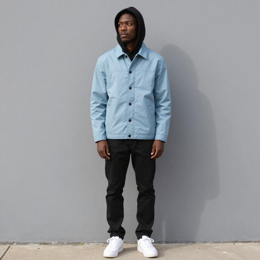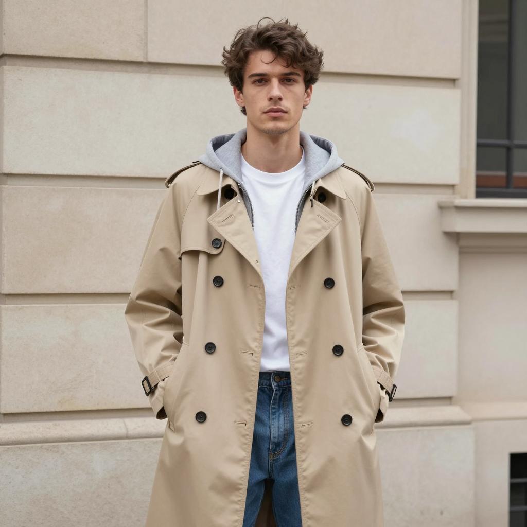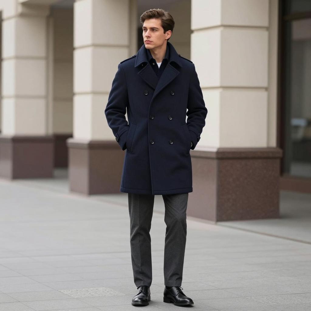 Black man fashion costume, photograph of a tall, black male, standing in front of a rough, brown stone wall, wearing a long black coat with a tied belt, black pants, and black boots, short black hair, serious expression, daytime, neutral background, full body shot, casual streetwear style, medium lighting, no accessories except a silver necklace with a pendant, standing on concrete floor, modern urban look, subtle shadows