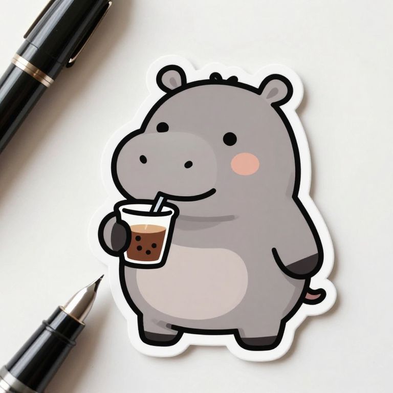 Fountain Pen cute sticker design as cartoon hippo character drinking coffee, die cut, very detailed, no lettering,