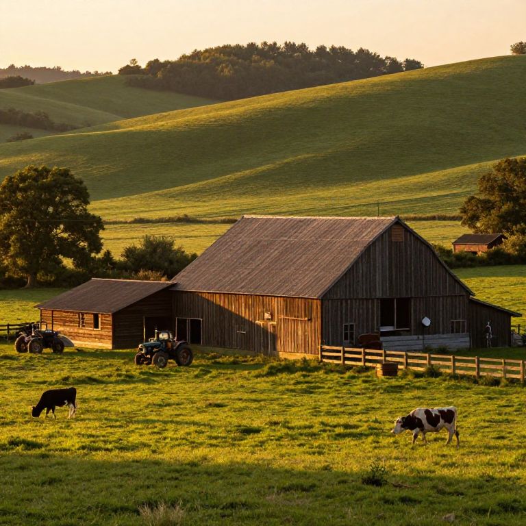 Dutch's rustic countryside farm at sunrise, golden light casting long shadows over wooden barns, rolling green hills, vintage tractors, lively farm animals, with a warm, nostalgic atmosphere and detailed textures in earthy tones.
