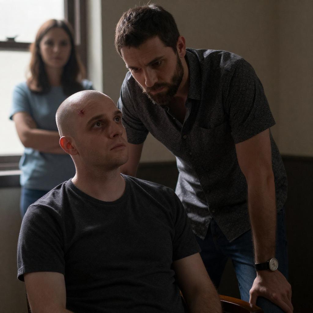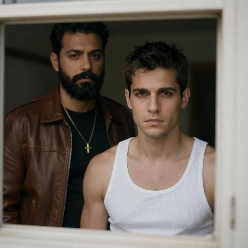 Photograph of two men in a sunlit hospital room. One man with dark hair, beard, and tan jacket sits on bed, leaning forward. Other man, bald with stubble, in patterned pajamas, sits back, sucking on straw. Both look serious. Beige curtains, tiled wall, metal bed frame.