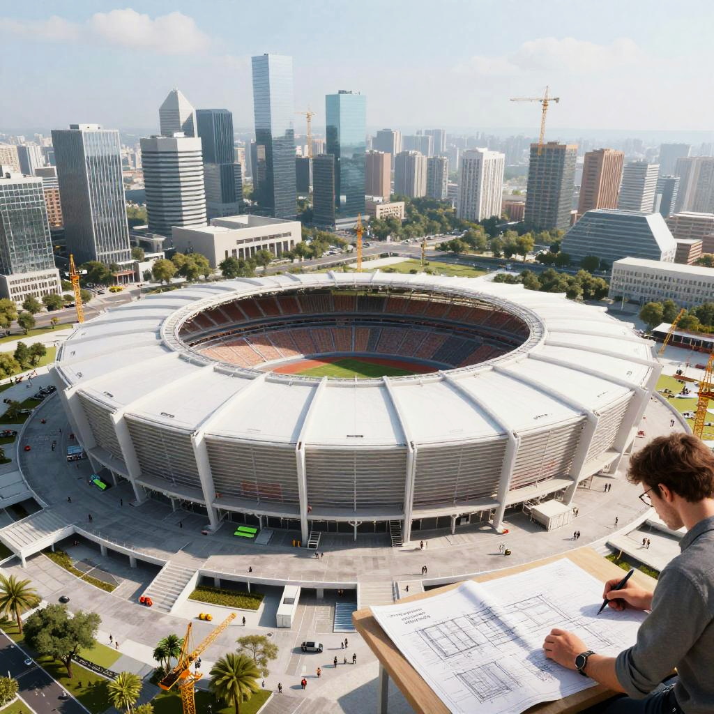 Stadium designer working on blueprints of a massive open-air stadium, featuring innovative retractable roof and eco-friendly materials, set in a modern cityscape with cranes and construction workers, hyper-realistic architectural visualization.