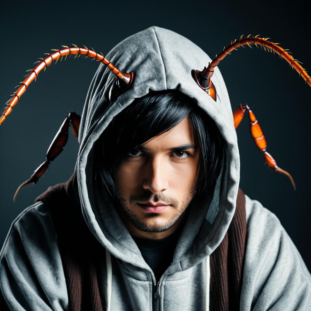 Portrait of a young man wearing a gray hoodie designed as a realistic cockroach costume with detailed antennae and legs. The man has black hair and a slight beard, staring directly at the camera with a serious expression. The background is dark, emphasizing the costume details and the subject's facial features.