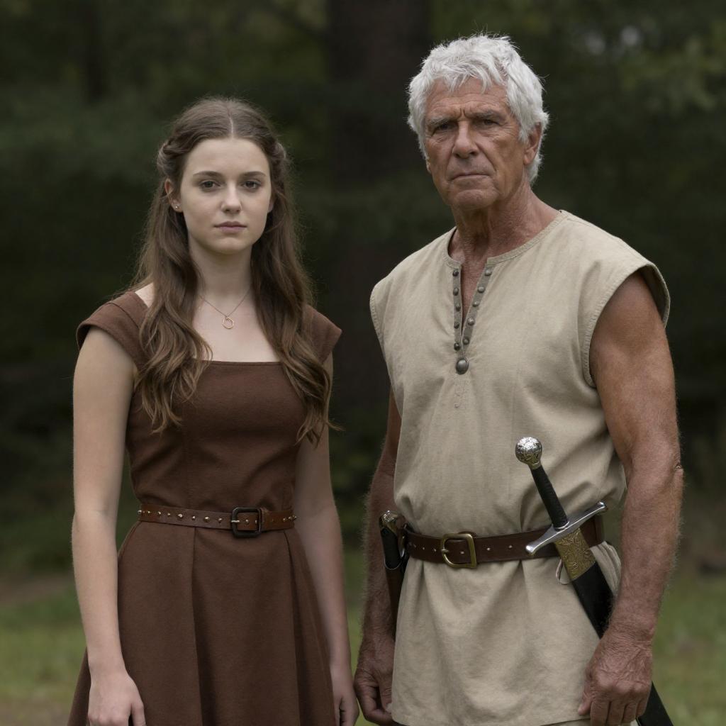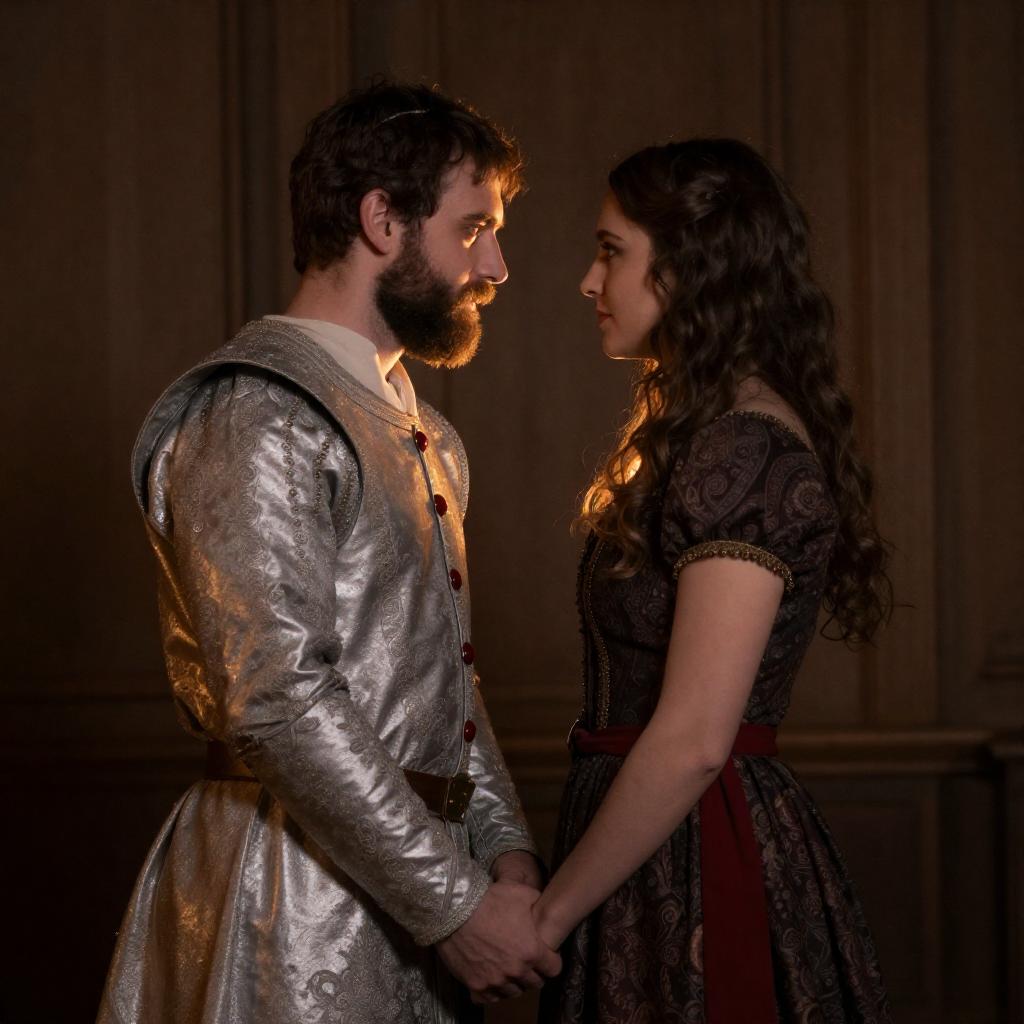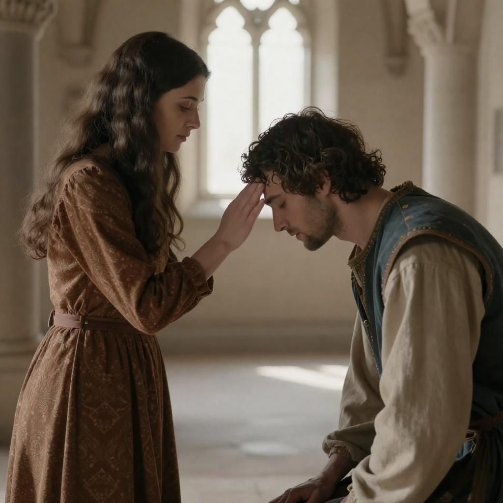 A photograph of an elderly bearded man with a fur-trimmed coat and a woman in a medieval-style headdress sharing a tender kiss. The man's eyes are closed, and the woman's hand gently touches his face. The background is blurred greenery. The woman's headdress has gold accents, and the man wears a ring on his right hand.