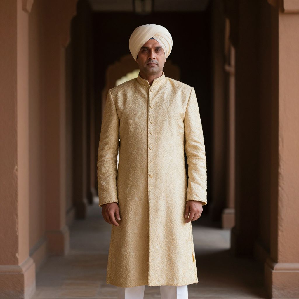 Photograph of a South Asian man standing in a dimly lit, narrow corridor with brown walls. He has a medium-dark complexion, wears a white turban, and dons a gold, embroidered, knee-length traditional coat with long sleeves. His expression is neutral, and he stands with his hands relaxed by his sides. The corridor has a tiled floor and the light coming from the front casts shadows behind him. The overall scene has a warm, slightly rustic ambiance.