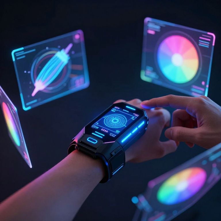 Photograph of hands interacting with a futuristic smartwatch displaying holographic rings and colorful orbs against a dark background.