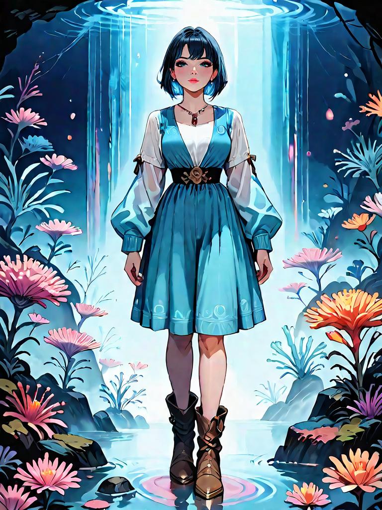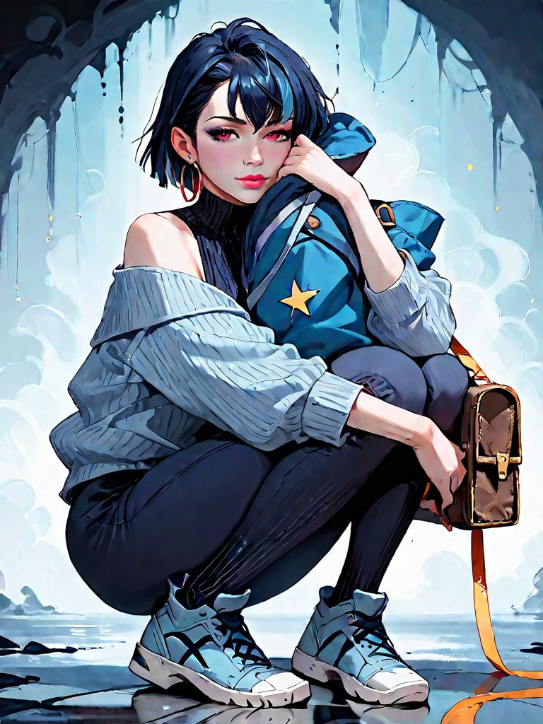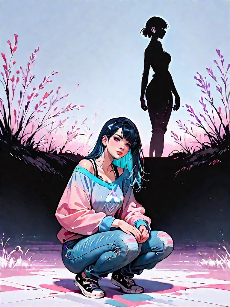Anime Girl in Pastel Knit Top and Jeans at Night