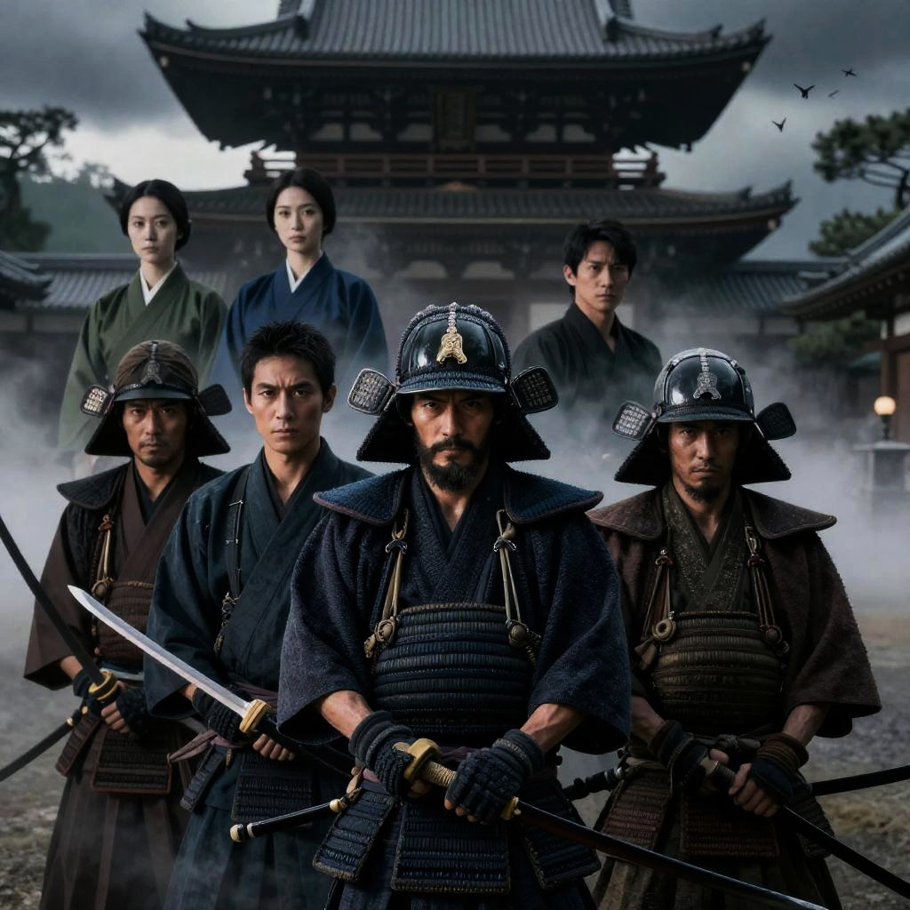 Group of Japanese men in blue and grey kimonos, standing and sitting, in a dimly lit room with wooden walls. Film crew with cameras in foreground. Some men holding wooden swords. Serious expressions. 19 men total. Lantern in background.