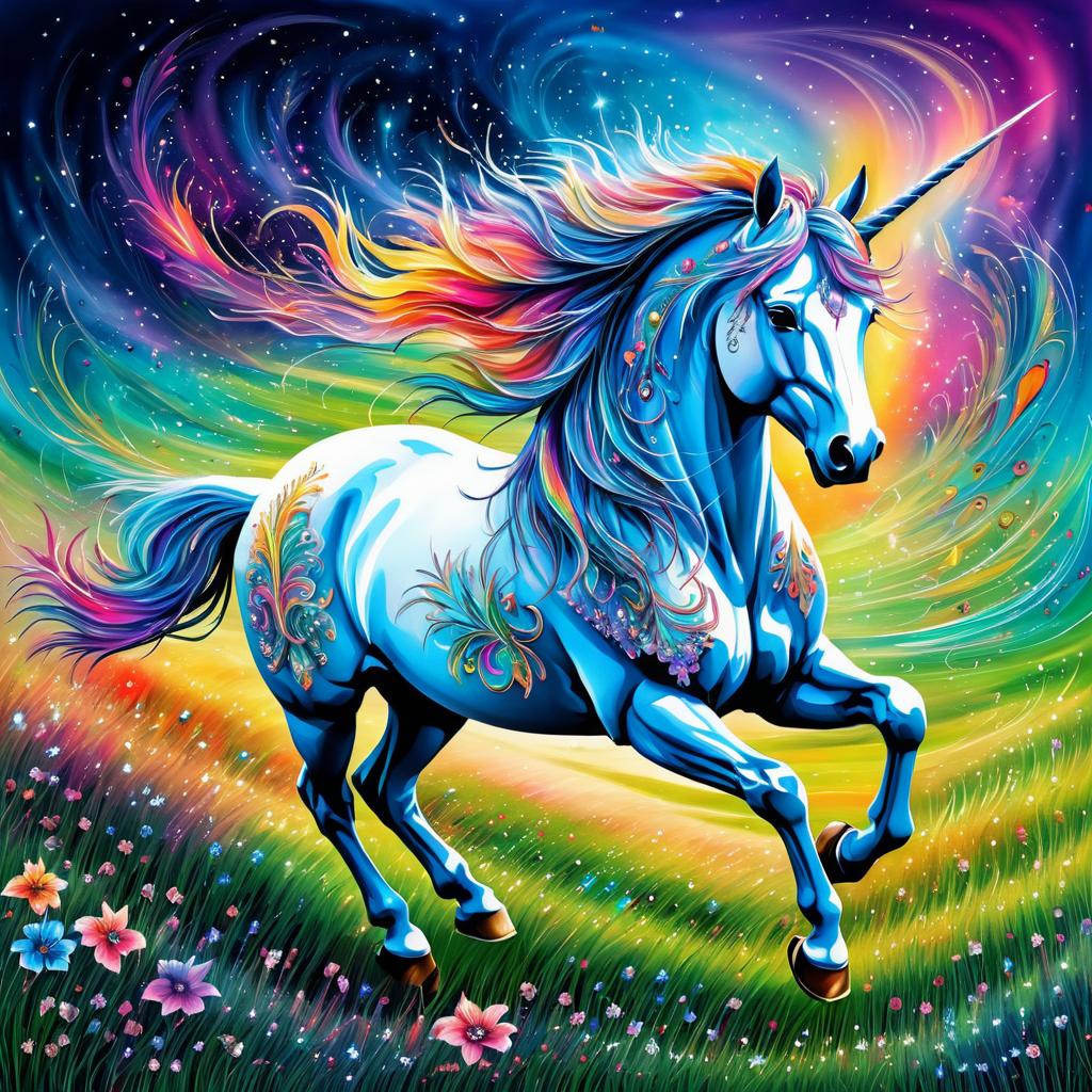 Fantasy painting of a mystical unicorn galloping through a meadow, with intricate detail and vivid colors.