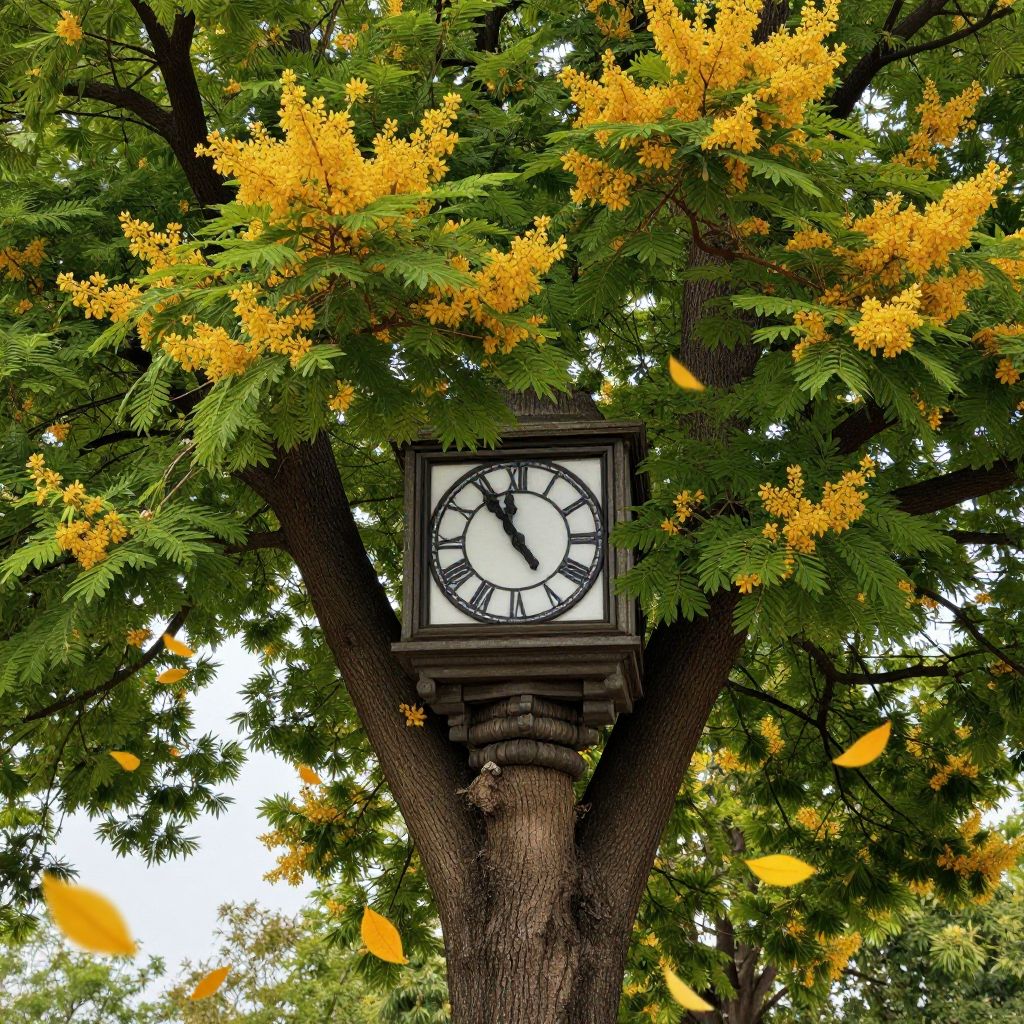 Clocktower emerges from a robust tree trunk, its Roman numerals encircled by vibrant green foliage and golden-yellow blossoms, as leaves gently drift downward in a serene, timeless scene.