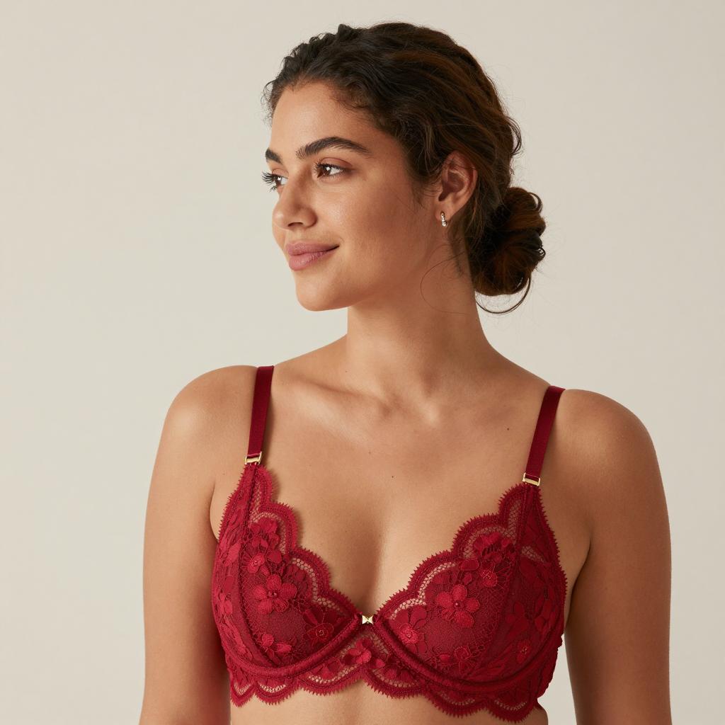 Woman with light brown skin, dark brown hair in a bun, wearing a red lace bra, looking to the left. Bra has floral patterns, straps with small gold clasps. Neutral background. Upper body focus. Slight smile, relaxed expression. Earrings visible on left ear.