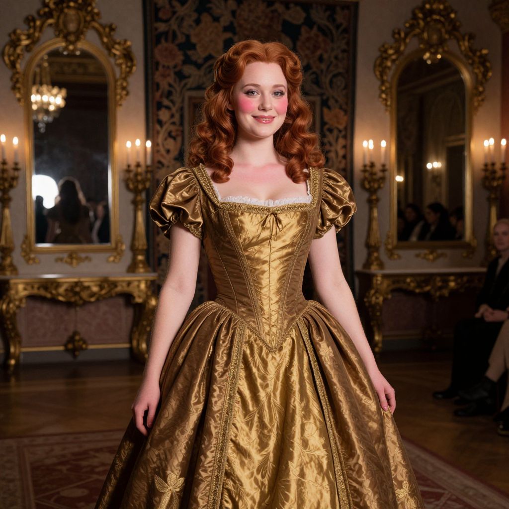 Photograph of a fair-skinned woman with red, wavy hair styled in vintage curls, wearing a gold, satin, 18th-century-style dress with puffed short sleeves and a corseted bodice. She stands confidently in an opulent room with ornate, gold-framed mirrors, candle chandeliers, and a dark floral-patterned wall. The dress's fabric shimmers under the soft, warm lighting, highlighting intricate embroidery. The background features a richly decorated, classical interior, adding to the regal ambiance. The woman's makeup includes pink blush and subtle red lipstick, enhancing her elegant appearance.