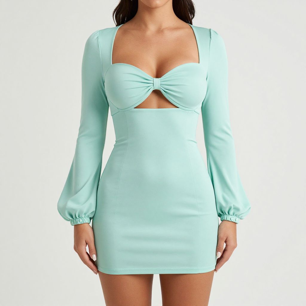 "Woman, modern chic, mint green bodycon mini dress, sweetheart neckline with a central knot, long bishop sleeves, fitted cuffs with button details, white background.. Sexy. Pretty face and beаutiful eyes. Big breasts."