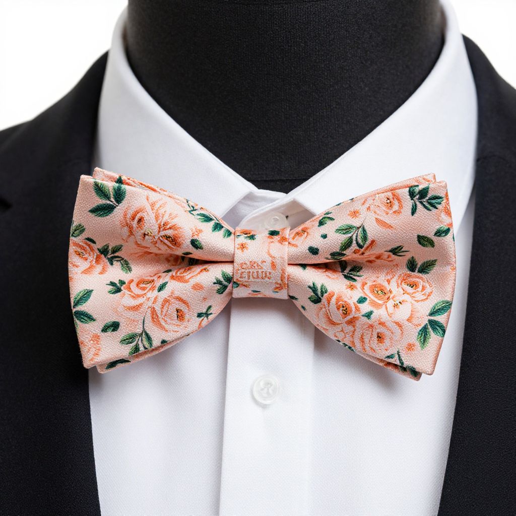 Two elegant floral bow ties, featuring vibrant green fabric adorned with pink roses and delicate greenery, are neatly arranged side by side on a crisp white card, accompanied by fresh green leaves in the corners.