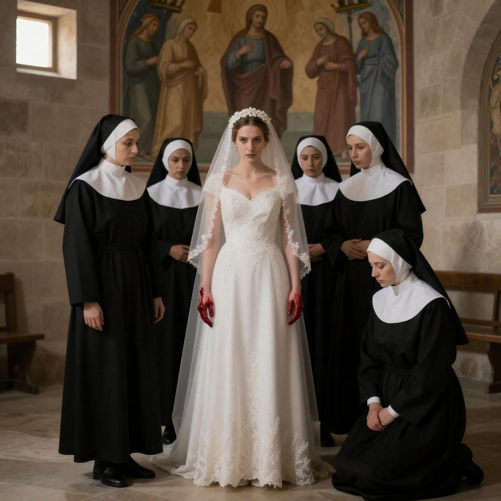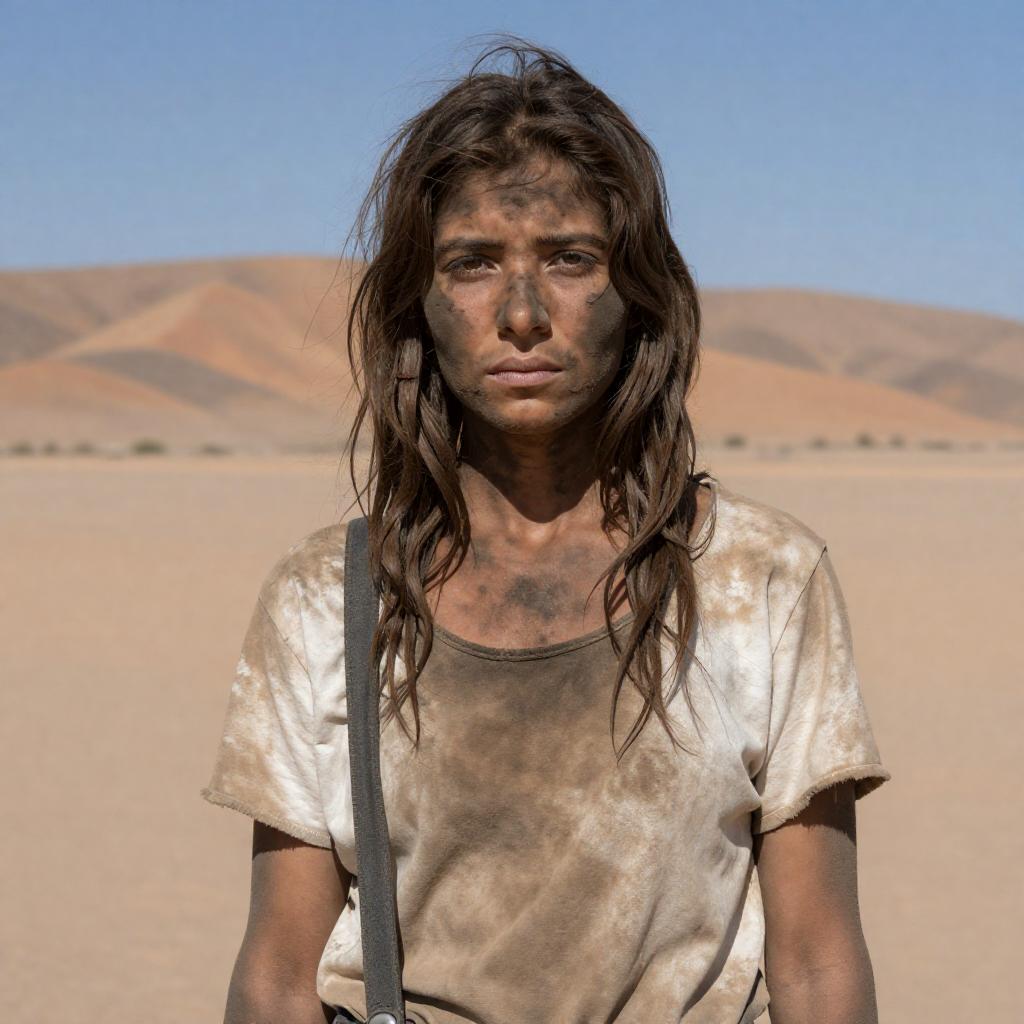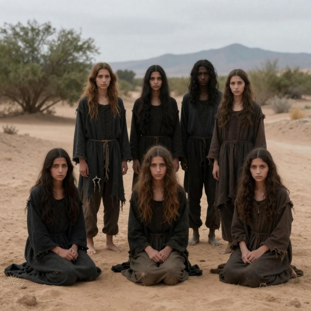 Photograph of six people with dark, tattered clothing standing or kneeling in a dry, sandy desert path. They have long hair and pale skin. Background includes green shrubs, trees, and distant mountains under a cloudy sky. Some individuals are sitting, while others are standing. All have intense, serious expressions. Dry, reddish-brown dirt covers their feet.