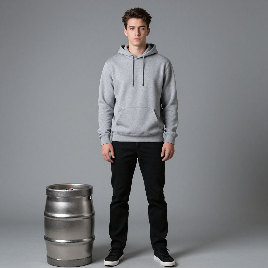 Photograph of a young Caucasian man with short, dark brown, slightly curly hair, standing against a plain gray background. He has a light complexion and a neutral expression. He wears a light gray hooded sweatshirt with a drawstring, black straight-leg pants, and black sneakers with white soles. To his left is a metallic, two-tiered barrel. The lighting is even, highlighting the simplicity of the scene and the casual, modern clothing style. The overall mood is minimalist and straightforward.