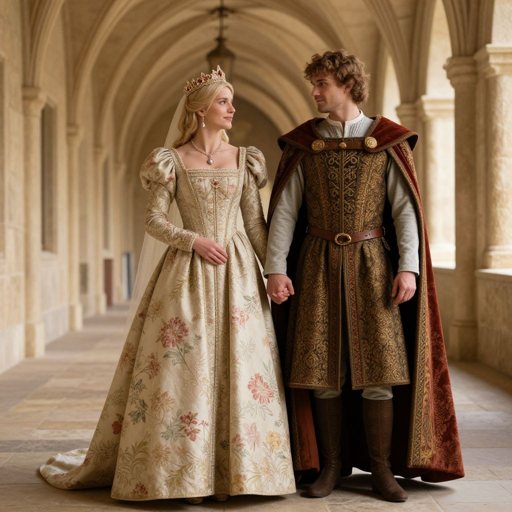 A digitally rendered medieval wedding scene featuring a regal couple adorned in ornate attire, with the woman wearing a floral-patterned gown and crown, and the man in a richly detailed vest and cloak, set against the backdrop of an elegant stone corridor illuminated by warm, golden-hour lighting.