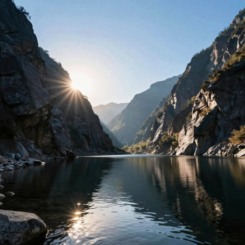 A stunning photograph of a mountain valley with steep, rocky cliffs on both sides. The bright sun is rising behind the mountains, casting starburst reflections on the calm, mirror-like water below. The sky is clear blue, and the water's surface perfectly reflects the sky and mountains. The sunlight creates a dramatic contrast between the dark rocks and the bright sky.