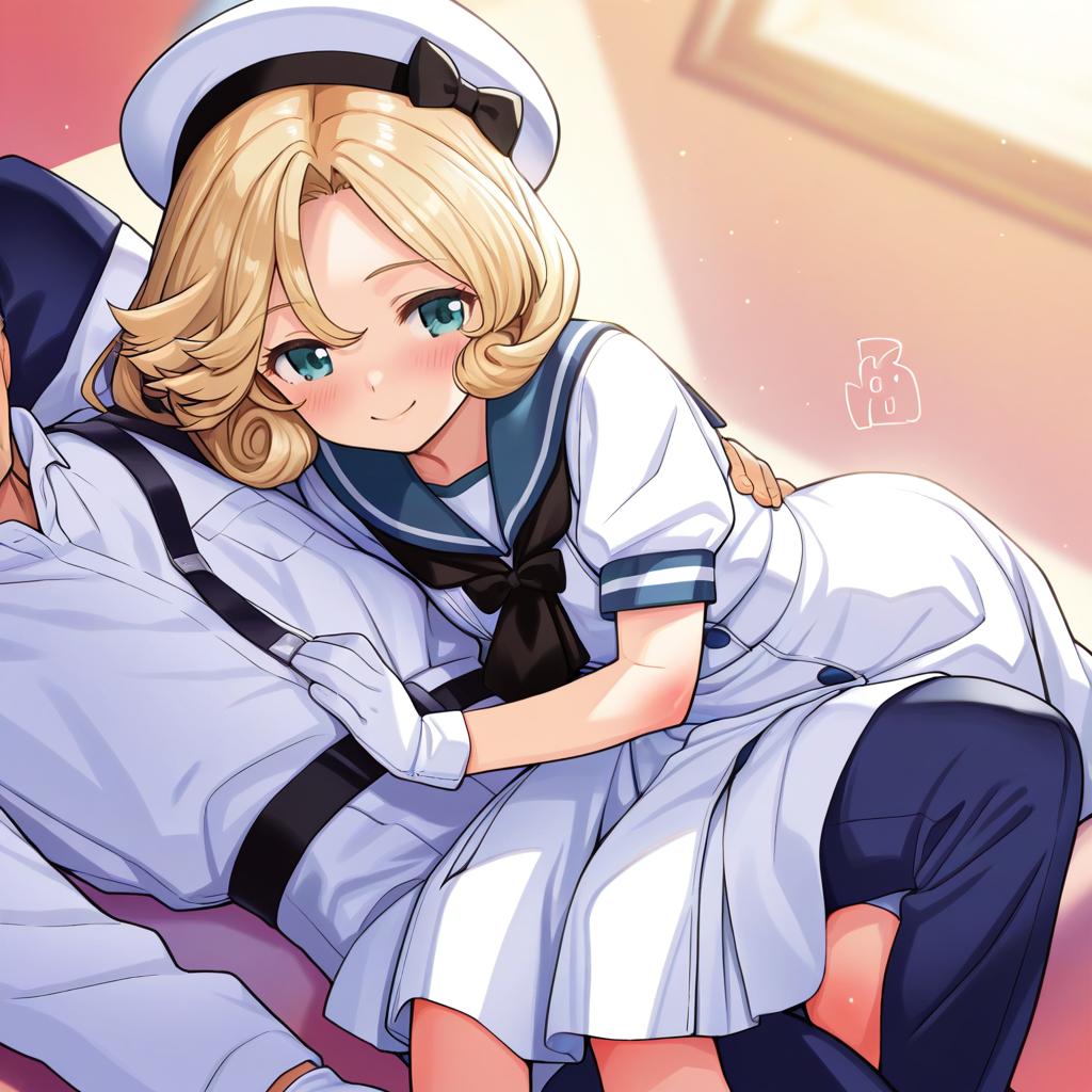 Janus (kancolle), kantai collection, 1girl, blue eyes, blonde hair, short hair, parted bangs, sailor hat, white gloves, sailor dress, white dress, white headwear, blue sailor collar, short sleeves, by artist kinocopro, illustrious