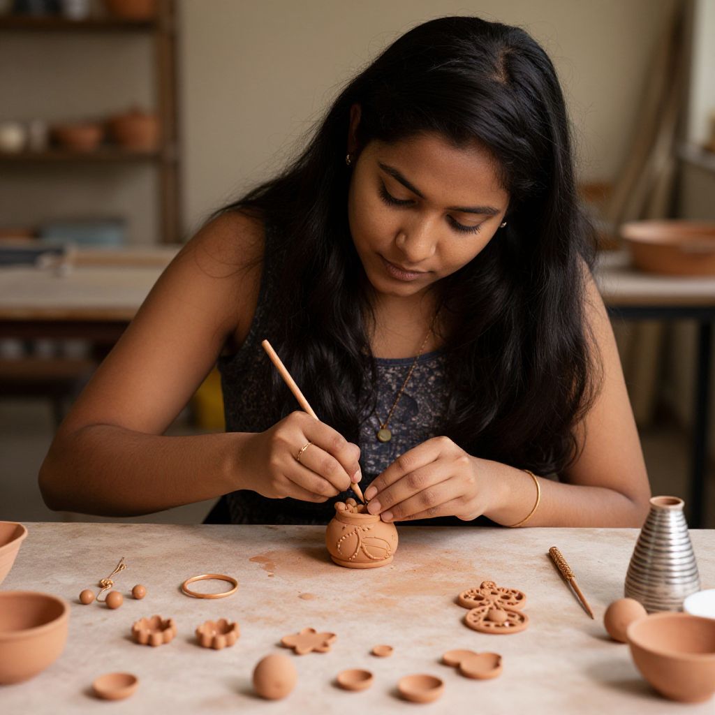 Otaku Young Indian woman artisan focused on molding clay into intricate forms of jewelery, with a collection of delicate terracotta pieces on her workspace.,