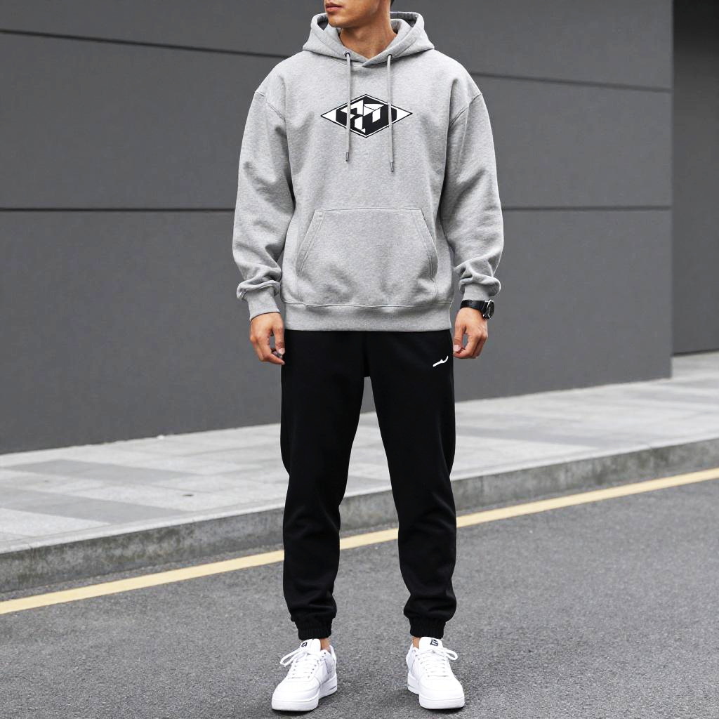 The image features a man confidently standing on a street, dressed in a stylish gray hoodie adorned with a graphic logo and sleek black joggers. His modern athletic look is enhanced by white sneakers, embodying a casual urban fashion aesthetic that's perfect for streetwear enthusiasts.