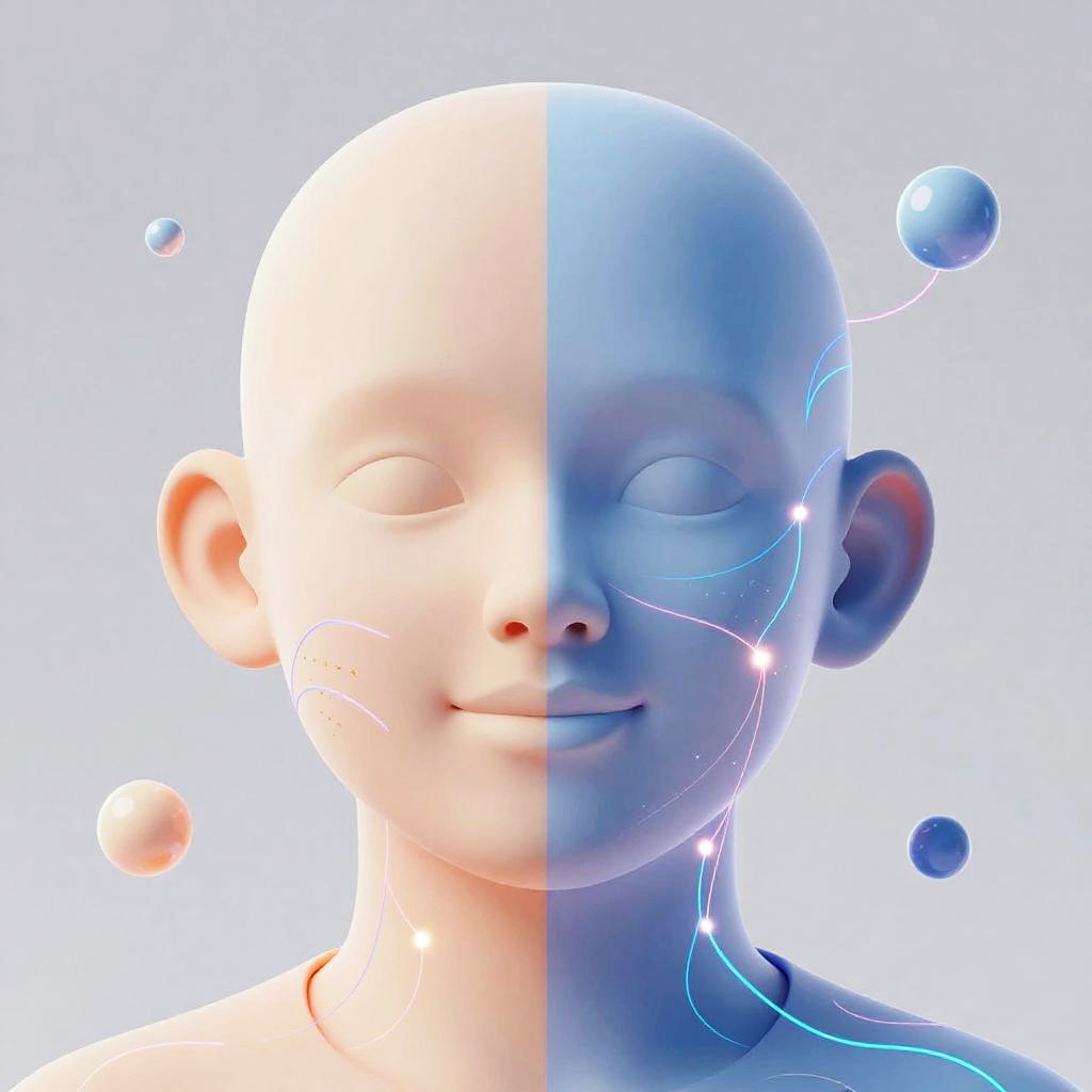 Visual representation of change facial expression AI, featuring a split face between neutral and smiling, connected by glowing data veins, abstract technology patterns, soft pastel colors mixed with neon highlights, modern and sleek design