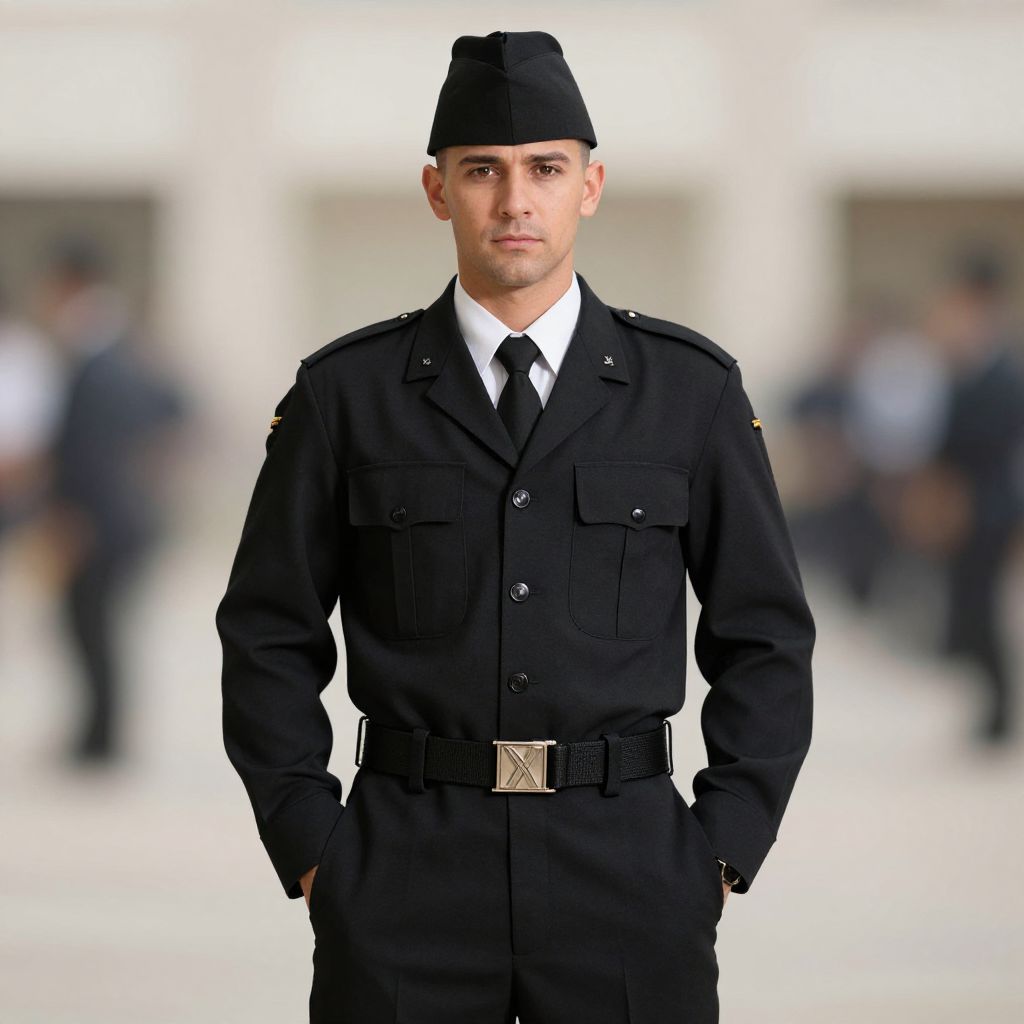 Man airline pilot costume, belt, black necktie, uniform, hat, necktie, shirt, 1boy, male focus, jacket, black belt, buttons, collared shirt, hands in pockets, belt buckle, pants, pocket, white shirt, military uniform, black pants, black jacket, solo, military, blurry, looking at viewer, buckle, cowboy shot, long sleeves, blurry background, breast pocket, black headwear, military hat, lapels, standing, peaked cap, military jacket, realistic, straight-on, closed mouth, notched lapels, wing collar, patch
