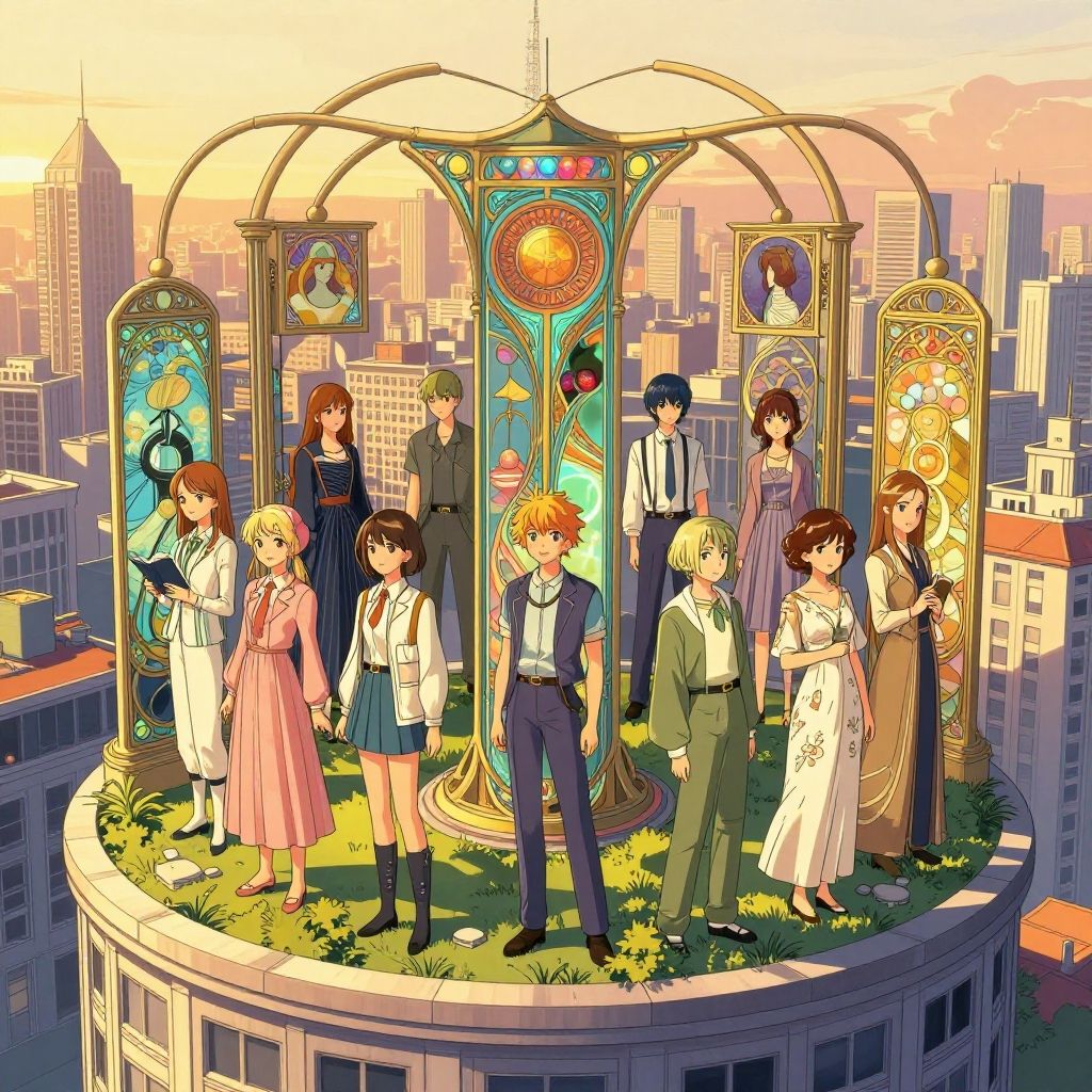 Illustration featuring twelve stylized zoetrope characters standing in a circular rooftop garden overlooking a dense cityscape at golden hour. The scene combines Art Nouveau curves and cyberpunk neon textures with influences from Pre-Raphaelite paintings and shoujo manga. The detailed digital artwork showcases fine inking lines, flat colors, and a warm sunset glow illuminating the city and rooftop architecture.