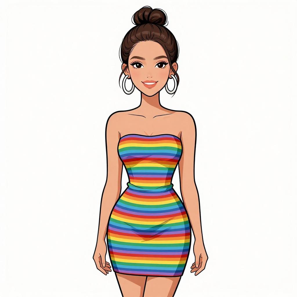 Woman with pretty face and pretty hair. smiling Woman, casual summer style, strapless bodycon mini dress with horizontal rainbow stripes, dark-hued sandals with chunky soles, minimal jewelry with hoop earrings, hair tied back in a high ponytail, plain white studio background. --sref 1467