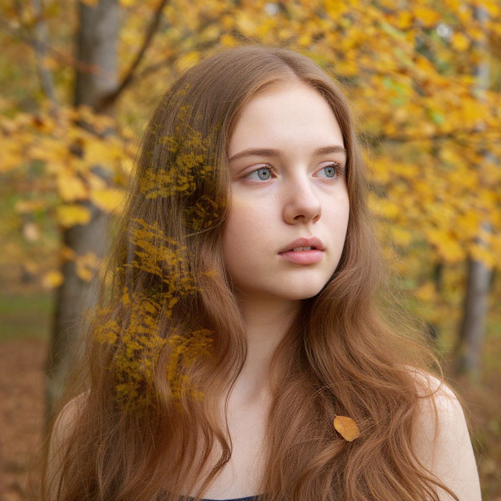 A double-exposure portrait showcases a young woman with porcelain skin and intense green eyes; her delicate features are emphasized by cascading chestnut hair. As she pensively looks into the distance, the background shifts from a soft focus of her surroundings to an ethereal forest scene filled with vibrant autumn foliage. The golden leaves intertwine with her tresses, creating a mesmerizing tapestry that encapsulates nature's beauty and the enigma of human expression. This captivating image demonstrates a harmonious blend of light and color dancing in perfect synchrony, evoking a sense of tranquility and wonder that lingers long after.