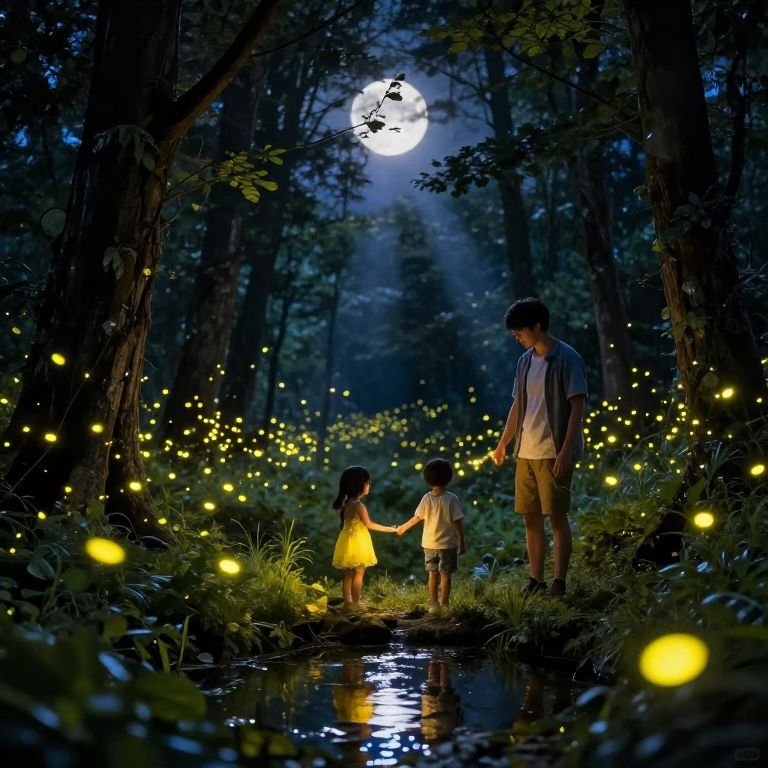 A digital illustration depicts a magical forest night scene under a glowing full moon. A man in casual clothes and two young children, one in a yellow dress and the other in a white outfit, hold hands while standing in a grassy clearing beside a reflective stream. Surrounding them are numerous glowing fireflies, creating a whimsical ambiance. Tall trees frame the background, adding depth and shadow. The children’s expressions are curious and gentle, while the man looks down at them with a warm, protective gaze. The overall mood is enchanting and serene.