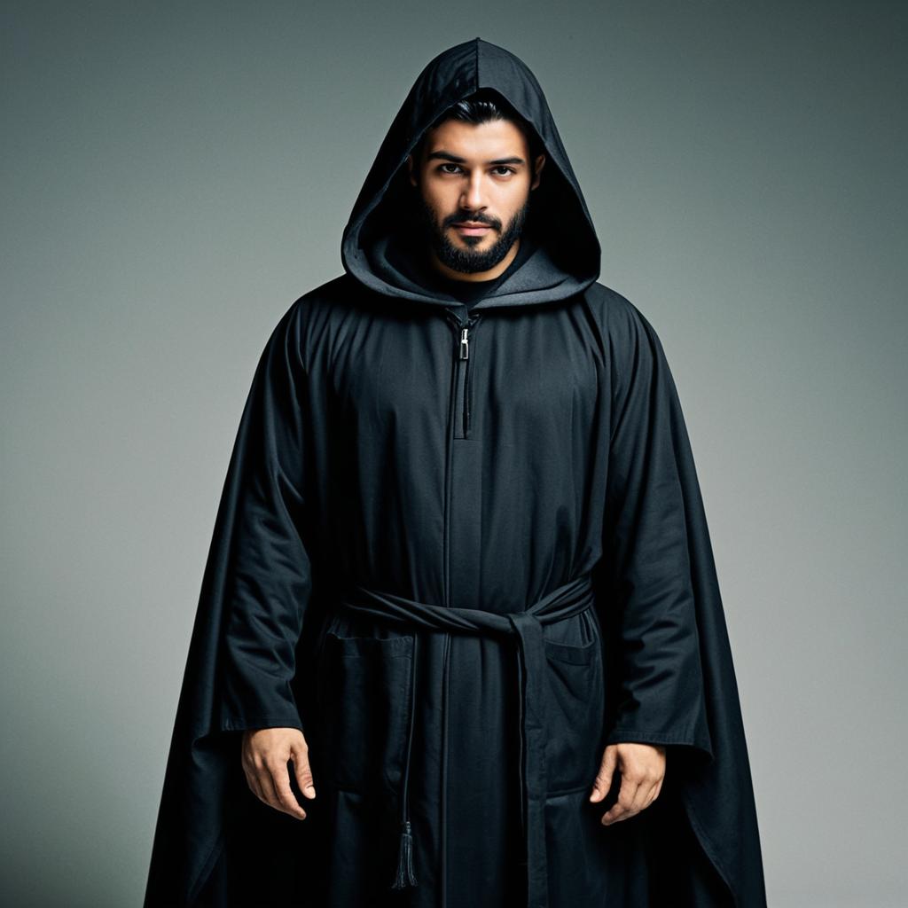 List funny halloween costume,solo, hood, black hair, male focus, looking at viewer, standing, 1boy, robe, hood up, horror (theme), grey background, realistic