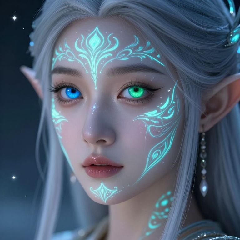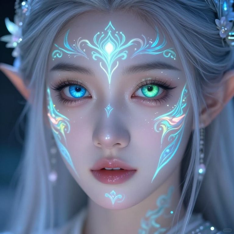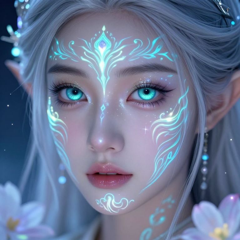 Digital art of a pale, ethereal woman with long, white hair and glowing blue eyes, conjuring a bright, magical flame in her hand against