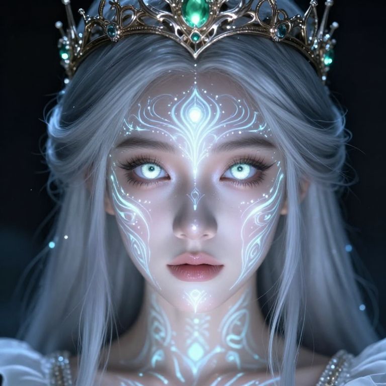 A digital artwork depicts a mysterious, ethereal woman with long, flowing white hair and piercing blue eyes. Her pale skin glows in the dim light, highlighting her delicate features. She holds a glowing, white, magical flame in her right hand, which illuminates her face and hair. She wears a simple, off-white garment. The background is dark and blurred, emphasizing her as the focal point. Her expression is intense and focused, adding to the mystical atmosphere. The image has a fantasy, otherworldly feel, with a high contrast between the bright flame and the dark background.