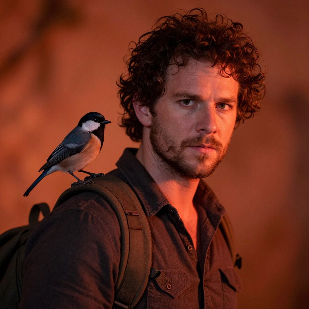 Photograph of a rugged-looking man with curly brown hair and a short beard, wearing a dark brown shirt and a backpack. A small blue and black bird is perched on his right shoulder. The background is blurred with warm, reddish-orange lighting, creating a dramatic, almost magical atmosphere. The man's intense gaze is directed at the camera.