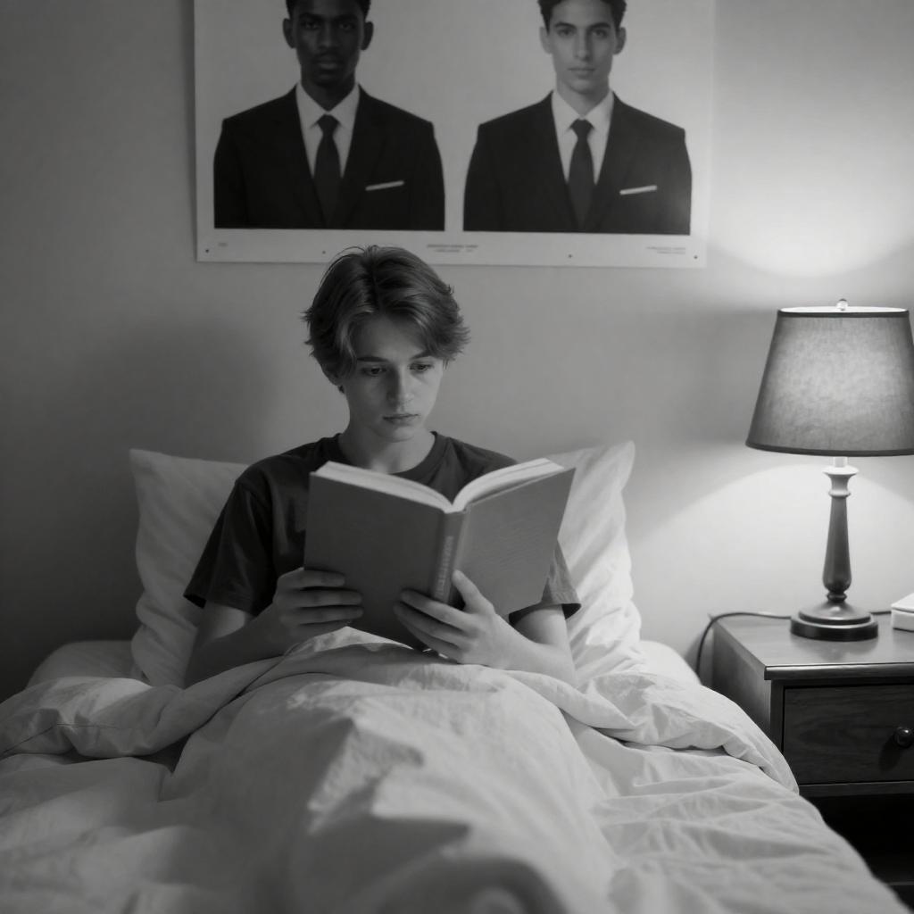 Black-and-white photograph of a young person with short hair, lying in bed, reading a book. They are covered with a blanket, wearing a dark shirt. To the right, a lamp with a dark shade sits on a nightstand. Above the nightstand, a poster shows two identical head-and-shoulder figures in dark suits. The person's expression is neutral.