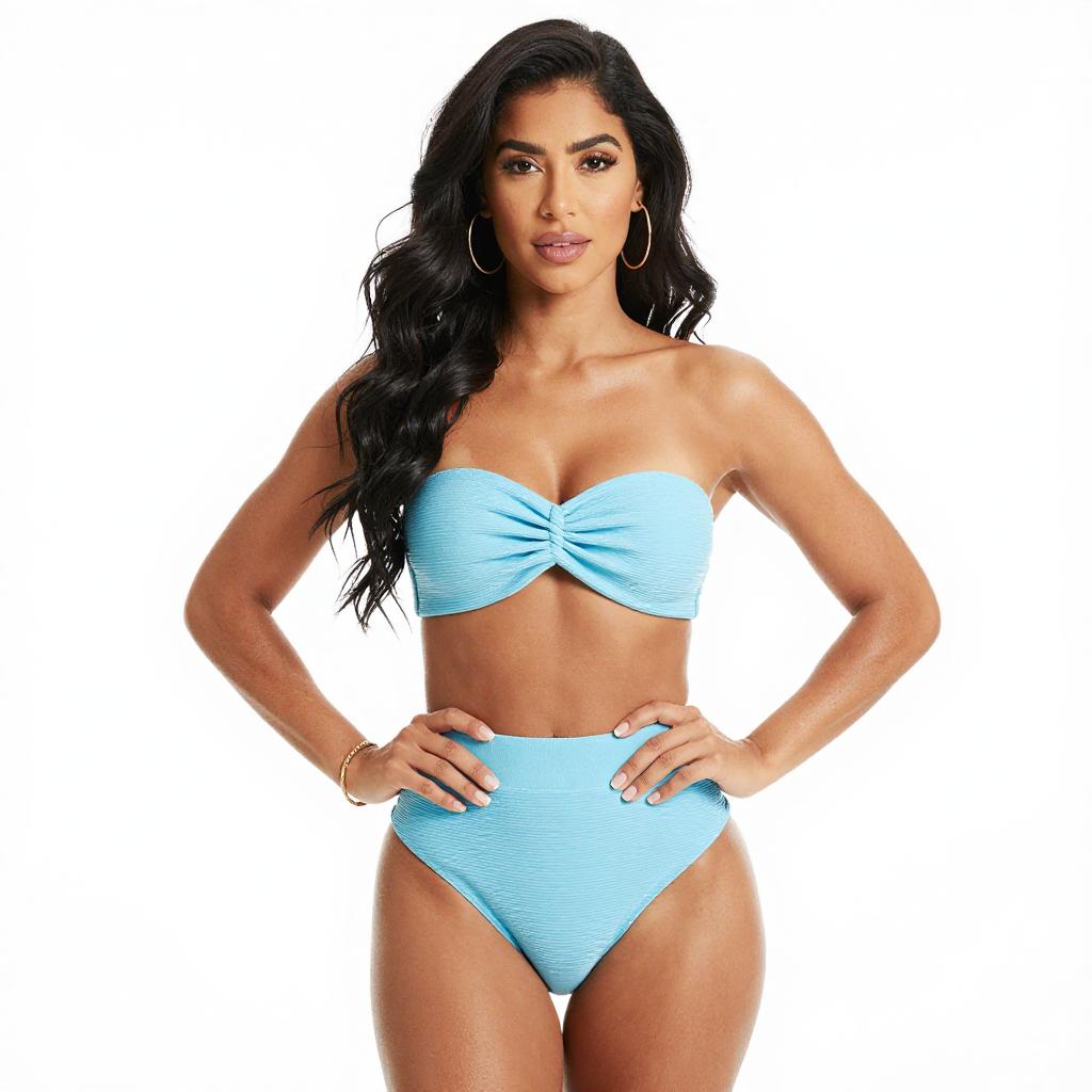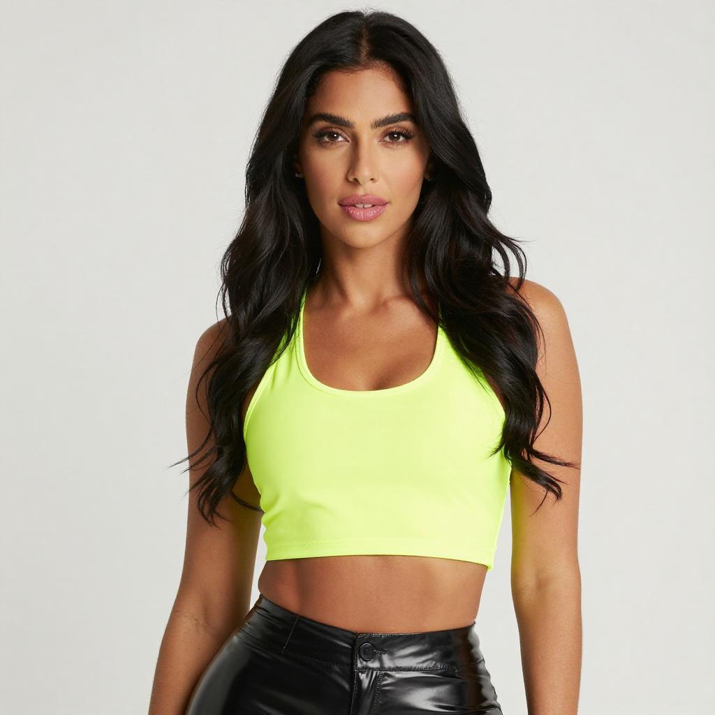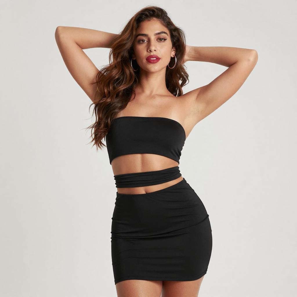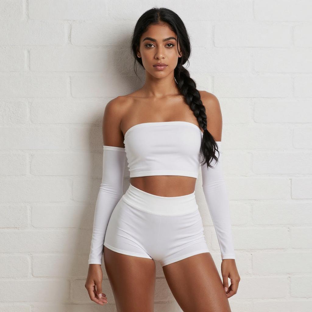 Photograph of a young woman with dark skin and long black hair in a side braid, standing against a white brick wall. She wears a white, long-sleeve, strapless crop top and high-waisted shorts, highlighting her toned midriff and legs. She gazes confidently at the camera with a neutral expression.