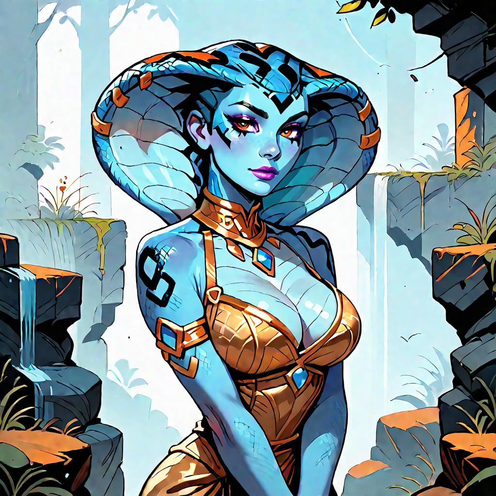 Score_9, score_8_up, score_7_up, score_6_up, score_5_up, score_4_up, sn4k3h41r, snake hair, cowboy shot, stone, gold, blue skin, large breasts