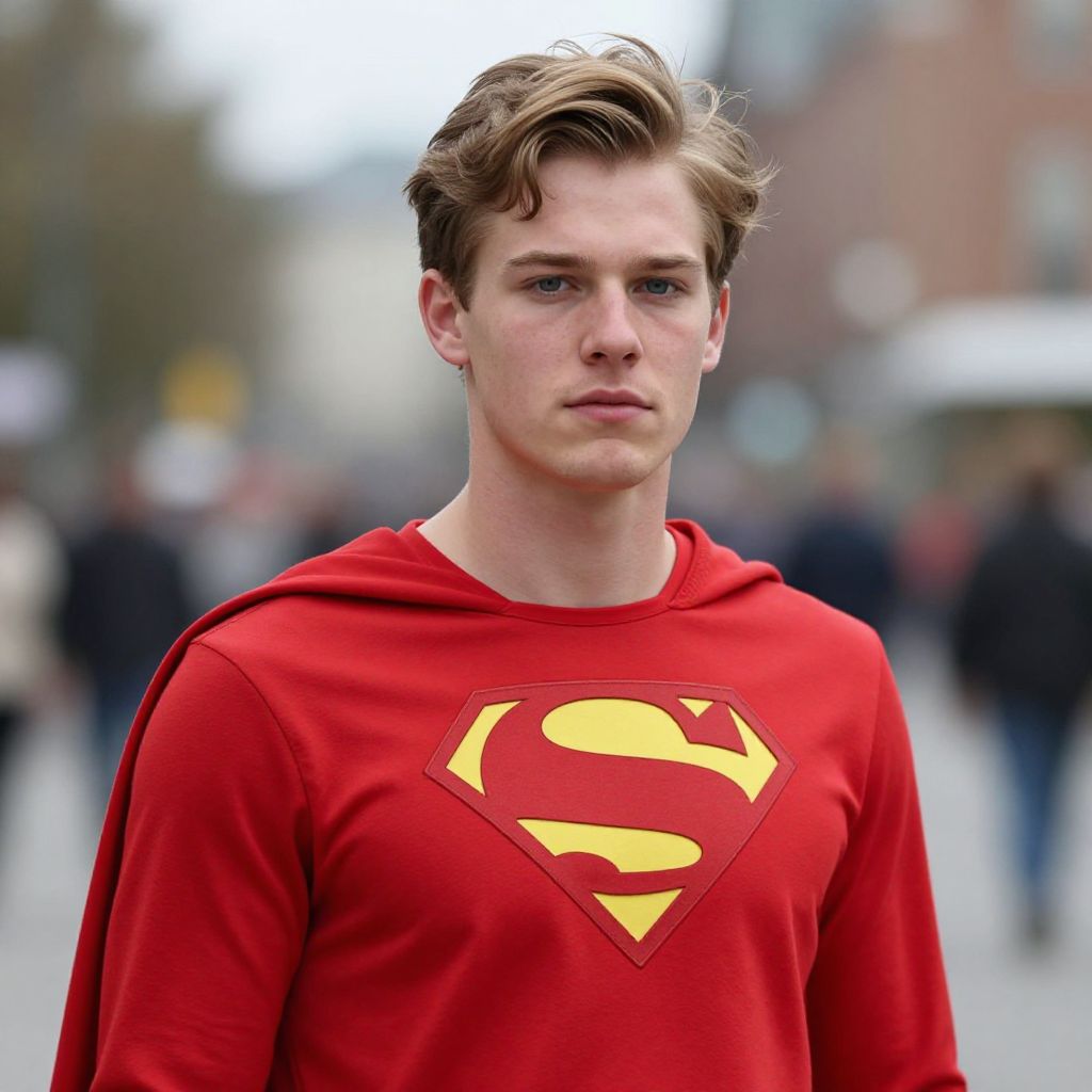 Photograph of a young man with fair skin, brown hair, wearing a black hooded superhero suit with a green emblem, standing in a blurred urban