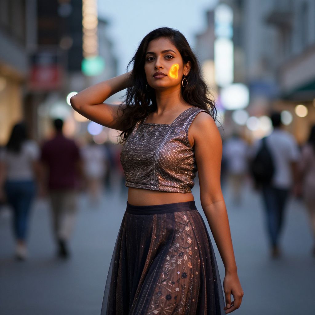 Photograph of a confident young woman with medium brown skin and long, wavy black hair standing on a bustling city street at dusk. She wears a sparkly, silver crop top and a high-waisted, sheer skirt adorned with sequins. Her right hand rests on her head, and a golden light is reflected on her left cheek. The background is blurred with colorful lights and indistinct figures, creating a bokeh effect. The street is illuminated by neon signs, giving the scene a vibrant yet urban feel.