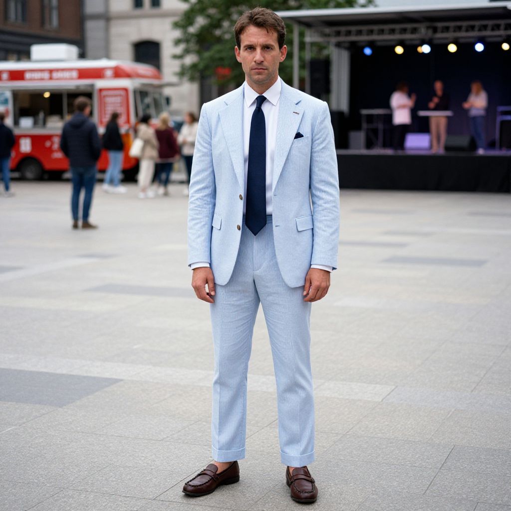 A man, light blue seersucker suit, tailored fit, white cotton dress shirt, navy silk tie, brown leather loafers, urban plaza, food trucks, live music stage, Ilford film stock, confident expression, relaxed demeanor. Man has masculine face and piercing eyes